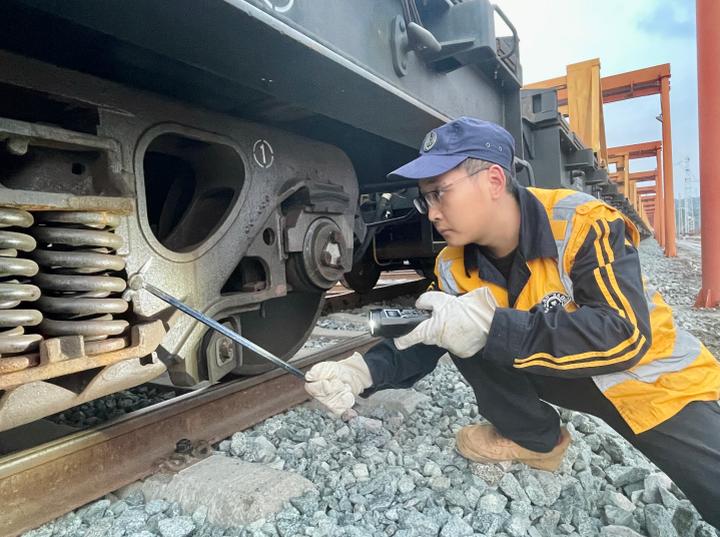 准备就绪后,保障团队及时奔赴中铁一局渝万高铁涪陵北铺轨基地,投入到紧张有序的现场工作中。他们对首列承担钢轨运输任务的车辆进行了全面、细致、深入的技术状态检查。检车人员秉持着“丝毫不差、精益求精”的工匠精神,不放过任何一个螺栓、一处焊缝、一个部件,严格按照技术标准对车辆走行部、车钩缓冲装置、制动系统等关键部位进行“地毯式”排查,确保车辆基础状态达标。