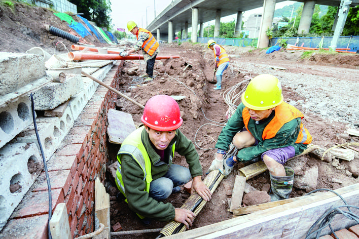 工人正全力推进路基、地下线缆等施工。
