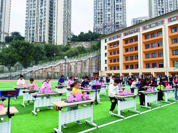 速叠杯现场,孩子们双手在高速状态的配合下,飞快地不断叠杯和收杯,整套动作下来,手臂、手腕和手指都得到了运动,挑战极限,挑战自己。赛场的另一边,孩子们快速转动魔方,整个校园充满了科技的活力与激情。