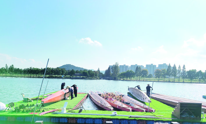 此时,书店的对岸,戴着草帽的船工们正细致地修补着龙舟,那个周末正要举办龙舟赛,村民们始终坚守着“竹韵工坊”“渔歌龙舟”等非遗项目,让历史不断延续。