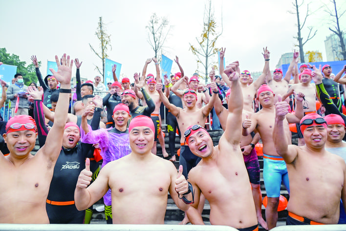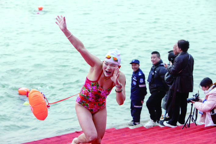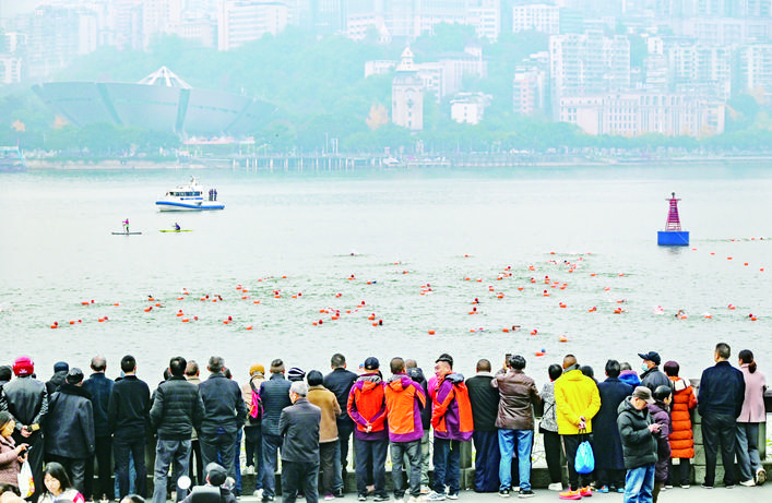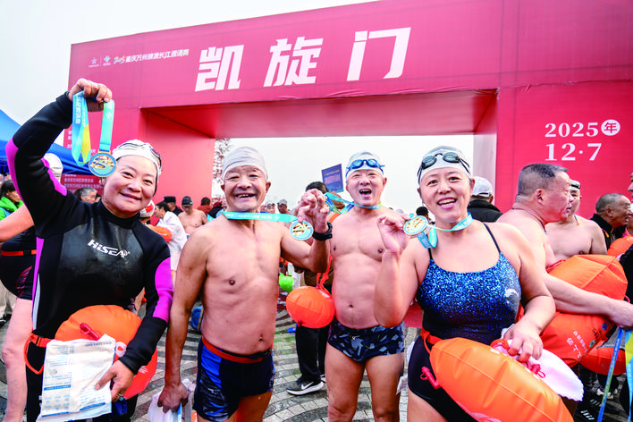 岸上,南门口广场至万州艺术街区沿线早已人头攒动,彩旗飘扬。市民的呐喊助威声、锣鼓声此起彼伏,与江中选手破浪前行的景象交织成一幅壮观的冬泳画卷。经过激烈比拼,来自湖南的选手卢岸峰率先触岸,夺得男子青年组冠军。“高手云集,这个冠军来之不易。”赛后卢岸峰难掩兴奋,“长江万州段水质非常好,游起来很舒服。赛事组织专业、服务贴心,观众也格外热情,希望这项比赛能一直办下去,越办越好。”