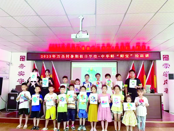暑假组织孩子共绘中华鲟“鲟宝”画像,普及中华鲟保护知识。