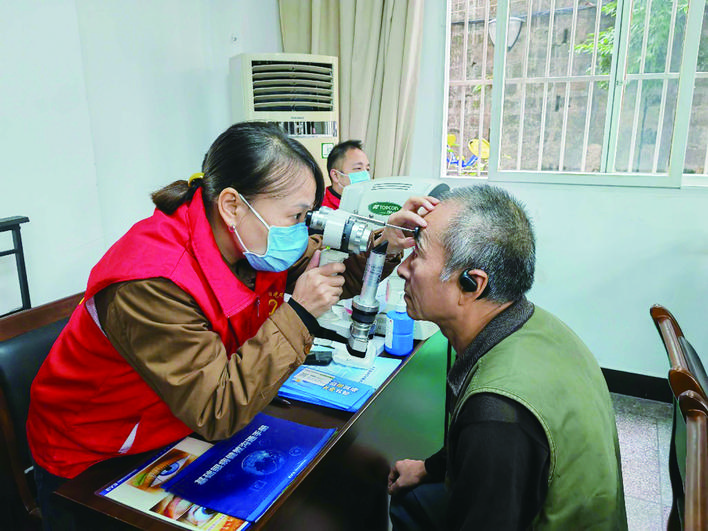 免费为社区老人检查身体。