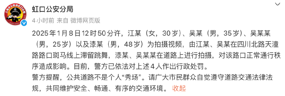 1月8日12时50分许,江某(女,30岁)、吴某(男,35岁)、吴某某(男,25岁)以及漆某(男,48岁)为拍摄视频,由江某、吴某在四川北路天潼路路口斑马线上滞留跳舞,漆某、吴某某在道路上进行拍摄,对该路口正常通行秩序造成影响。目前,警方已依法对上述4人作出行政处罚。