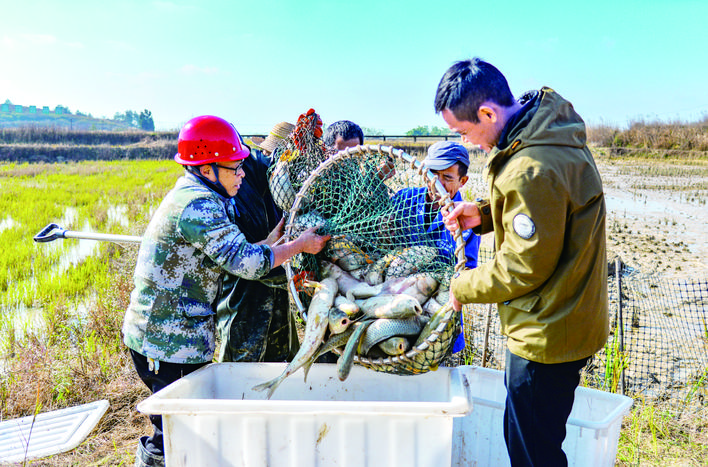 龙沙镇,村民忙着收获稻田鱼。