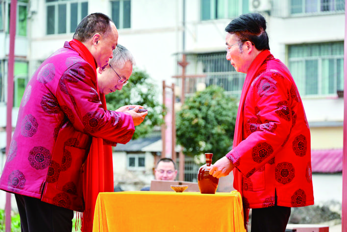 仪式在拥有百年窖池的重庆百年诗仙酒业有限公司生产车间举行,在弥漫着岁月醇香的车间里,身着传统服饰的传承人向企业技术骨干行敬酒礼,随后传授窖泥养护技艺。