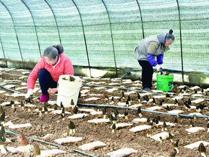大棚里,3位村民正分散在各畦间忙碌。60多岁的杜兴英动作格外麻利,她弯腰俯身,眼睛紧盯着菌畦,左手扶住菌柄,右手轻轻一掰,一朵羊肚菌便稳稳落入筐中。