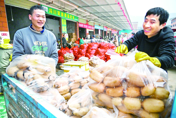 近日,万州区百安港农产品批发市场,商家忙着搬运、销售蔬菜、水果等农产品。据了解,临近春节期间,百安港农产品批发市场日交易量达1400吨,各类丰富的农产品可充分保障节日期间的供应需求。