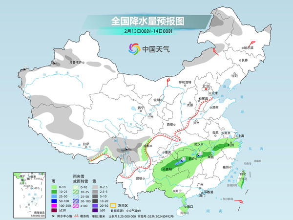 后天,内蒙古东部、黑龙江北部、新疆沿天山地区和南疆西部山区、西藏东南部、川西高原等地部分地区有小雪或雨夹雪,其中,内蒙古东北部、新疆伊犁河谷和南疆西部山区、西藏东部、川西高原南部等地部分地区有中到大雪。贵州、湖南、湖北南部、江西北部、安徽南部、浙江北部、广西西部和北部、台湾岛等地部分地区有小到中雨,其中,湖南中部、贵州东北部等地部分地区有大雨。