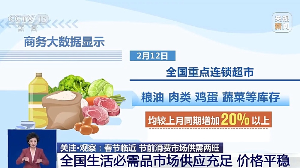 商务大数据显示,2月12日,全国重点连锁超市粮油、肉类、鸡蛋、蔬菜等库存均较上月同期增加20%以上,全国生活必需品市场供应充足,价格总体平稳。为做好春节期间市场保供工作,商务部加强粮、油、肉、蛋、奶、果、蔬等生活必需品市场监测,组织各地商贸流通企业加强产销衔接,拓宽货源渠道,丰富节日市场供给。