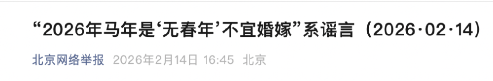北京网络举报发文辟谣称,事实上,“马年无春”是农历与公历历法差异的自然结果,“无春年”“两头春”平均每19年出现7次,与吉凶无关。
