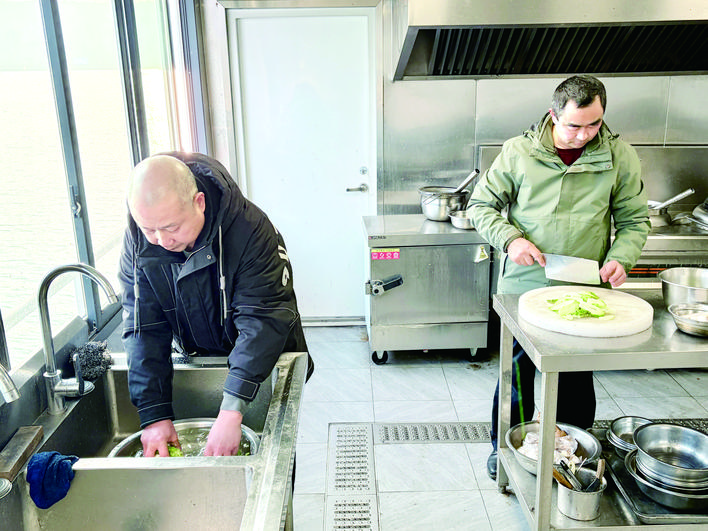 兄弟俩在趸船的厨房里做饭