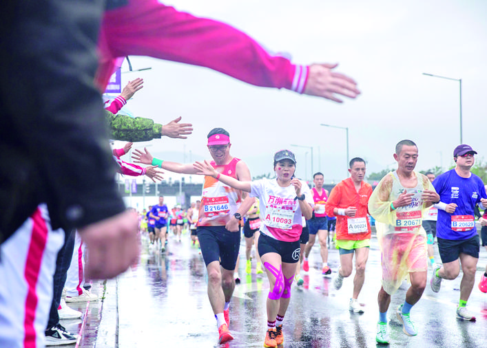 赛道沿途设置12个群众文化氛围营造点,腰鼓队、健身操、啦啦队轮番上阵,2500余人为跑者加油助威,让雨中的赛道暖意融融。
