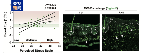 研究团队从临床患者入手,发现那些自感压力大的皮炎患者,血液中一种叫“嗜酸性粒细胞”的免疫细胞数量明显偏高。动物实验进一步证实:心理应激状态下,这种细胞会大量涌入皮肤真皮层,成为加重炎症的“主力”。