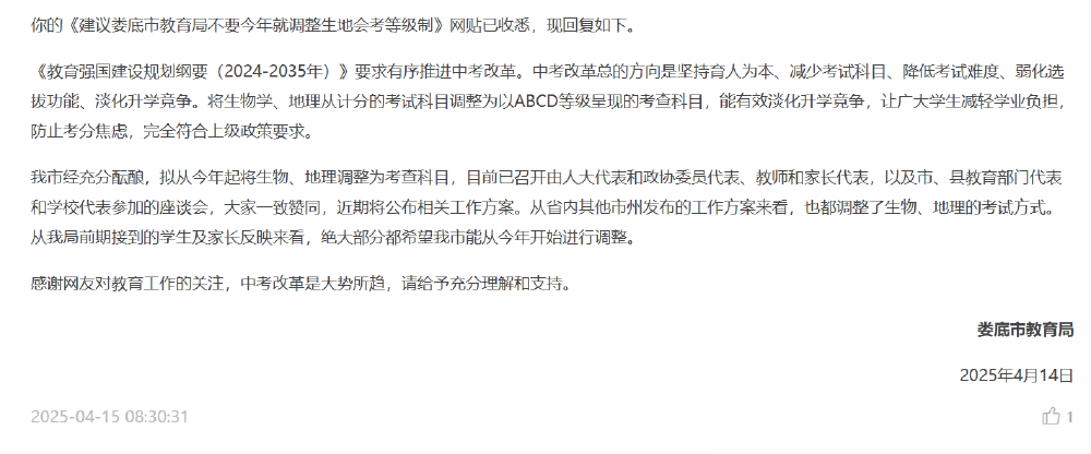 2025年3月,江西赣州市教育考试中心也收到了一则关于地理生物不再计入中考总分的建议。