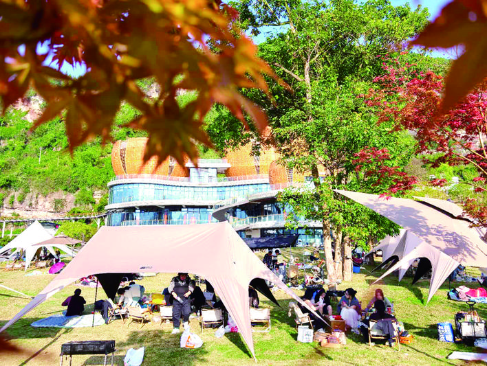 小桔灯生态文化旅游区,游客在露营帐篷下享受春日暖阳。