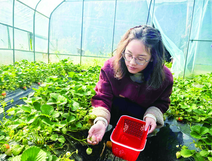 在草莓大棚里,游客们提着小篮,俯身穿梭在田垄间精挑细选,体验采摘的乐趣。