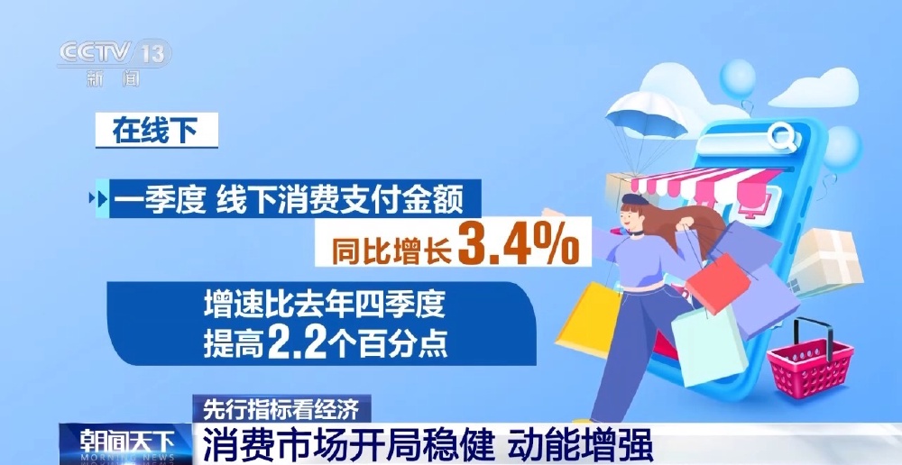 在线下,一季度线下消费支付金额同比增长3.4%,增速比去年四季度提高2.2个百分点。
