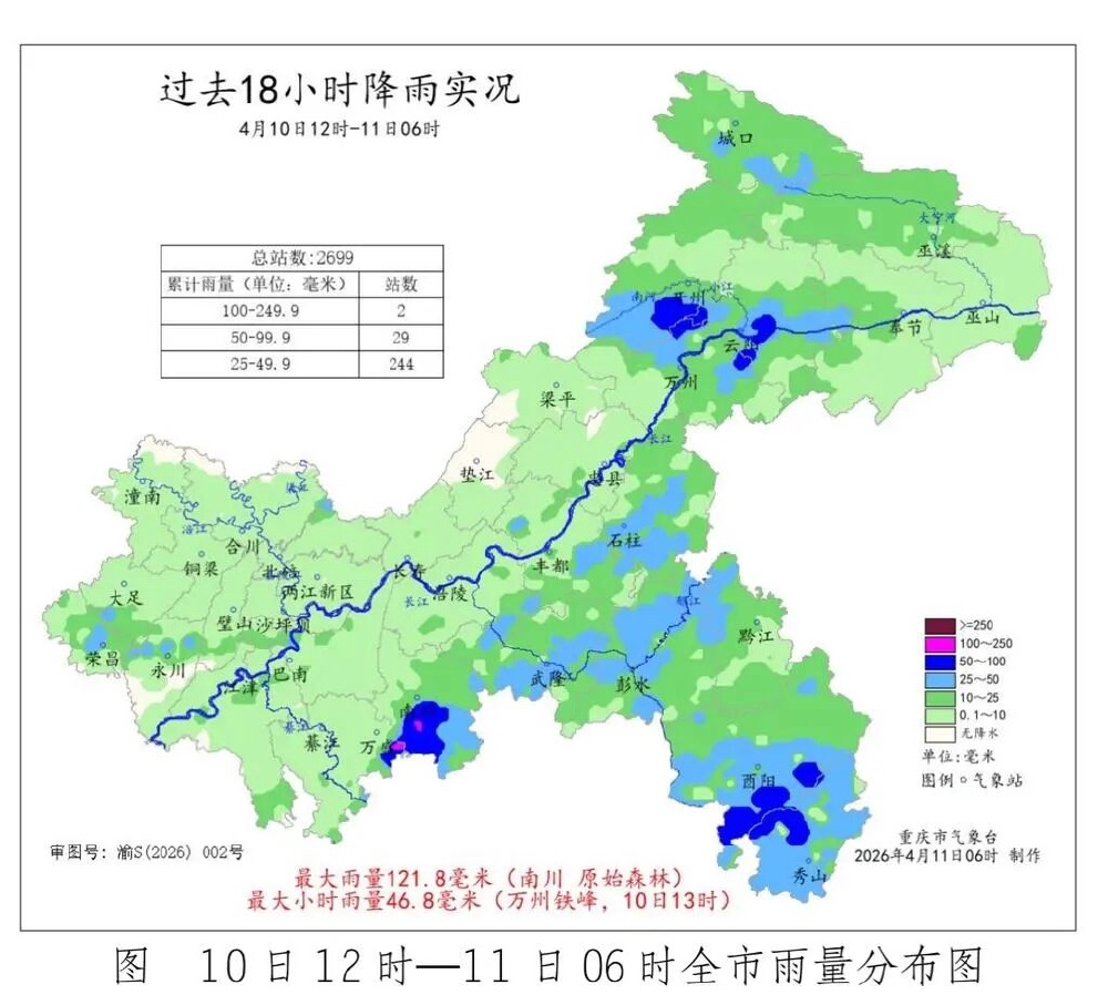 昨日今晨重庆的雨有多大?4月11日,重庆市气象台发布降雨实况通报,10日12时—11日6时,重庆各地阵雨或雷雨,部分地区出现阵性大风和冰雹。