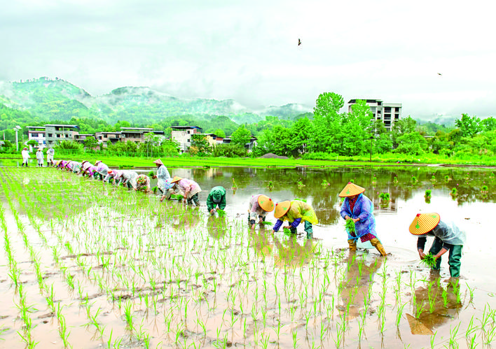 “雨生百谷,农时不等人。”趁着充沛雨水,万州各地抢抓墒情忙插秧苗,勾勒出一幅“雨田绣青针”的画卷。