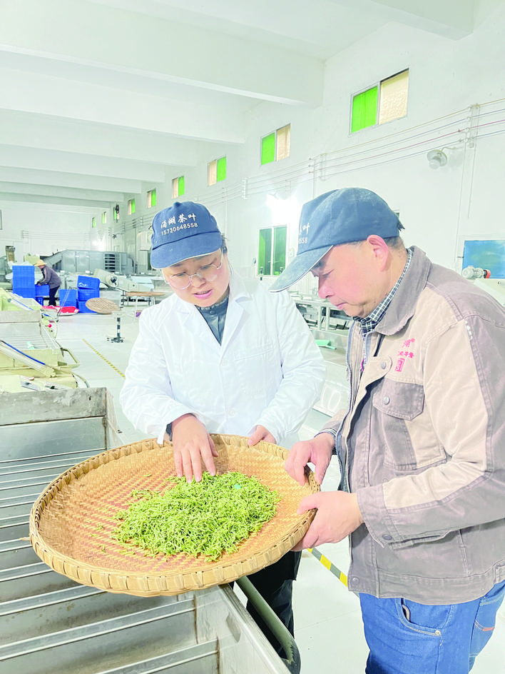 何小丽(左)查看茶叶。