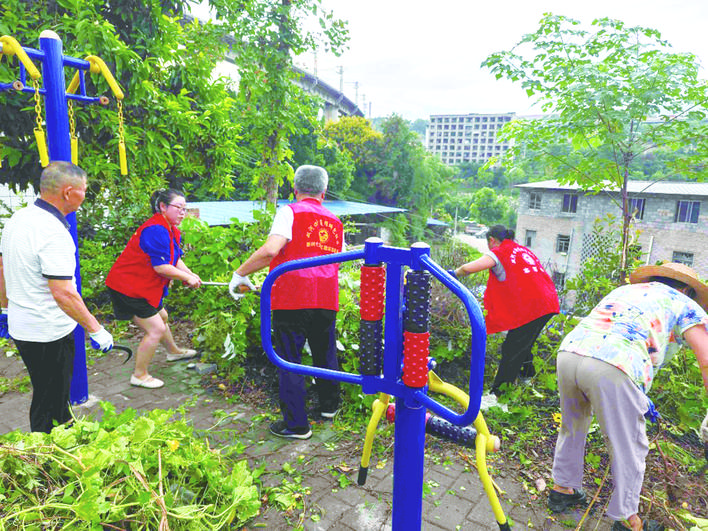 社区干部和志愿者正在清理垃圾。