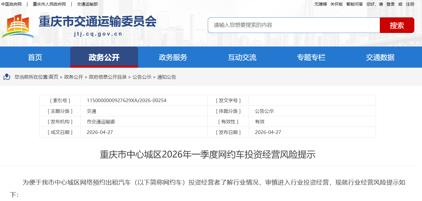 4月27日,重庆市交通运输委发布中心城区2026年一季度网约车投资经营风险提示(以下简称提示)。